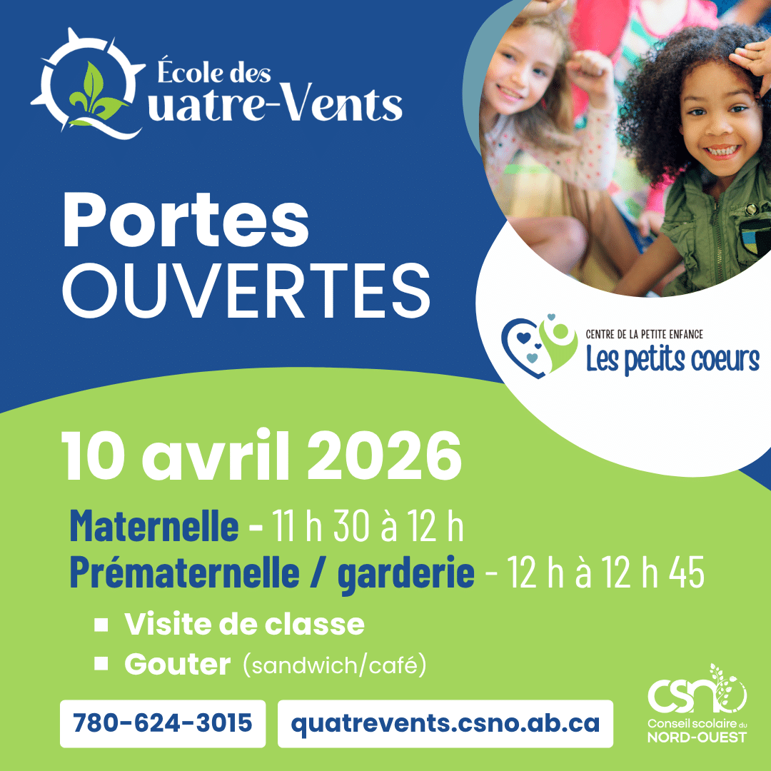 École des Quatre-Vents | 10 avril | Peace River Et si votre enfant pouvait grandir, apprendre et s’épanouir en français dès la petite enfance? Le vendredi 10 avril, venez explorer nos programmes francophones de la petite enfance et découvrir un […]